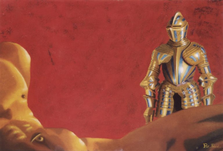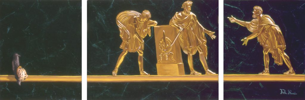 Ce type de peinture est donc très cérébrale. Une lecture, un documentaire, une discussion, un film me touche, m’interpelle, me fait réagir. Un raisonnement prend forme et je cherche comment l’exprimer en image. Toute une recherche documentaire s’en suit.